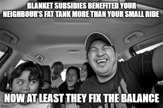 The system was simpler in application: you use RON95 or diesel, you pay the subsidised price. No eligibility testing, no exclusions. If you had a car, you would benefit. If you were a frequent traveler, you would benefit. Big SUVs & small Myvis alike.